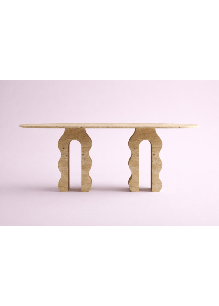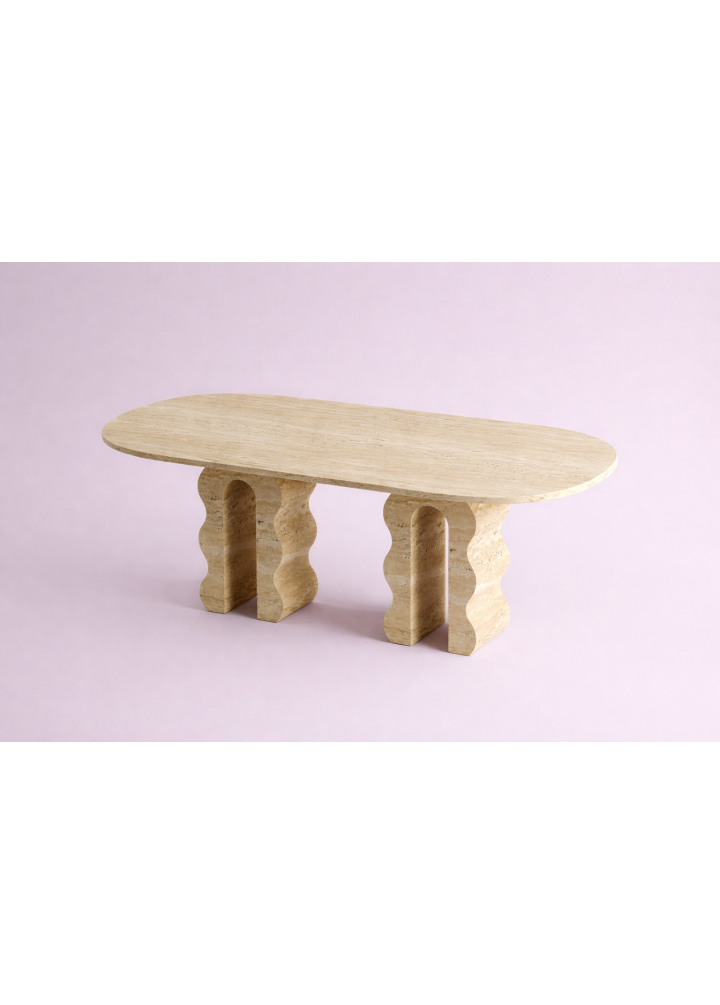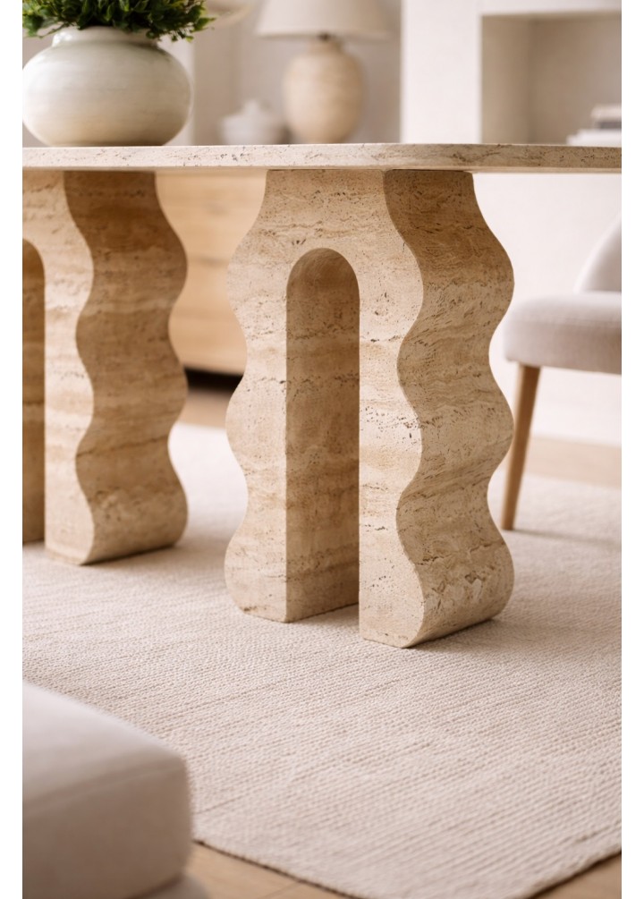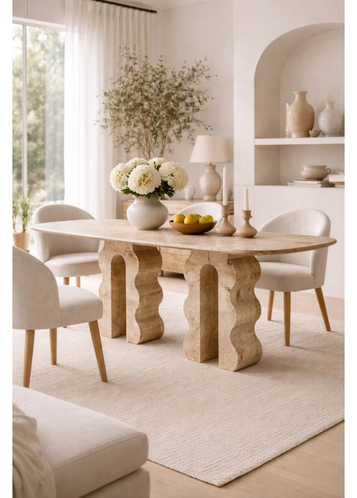 Amalfi Traverten Yemek Masası, akışkan formda tasarlanmış ayak yapısı ve doğal traverten dokusuyla mekâna heykelsi bir karakter kazandırır. Dalga formunu andıran taşıyıcı ayaklar, klasik düz formların dışına çıkarak güçlü bir tasarım dili sunar.