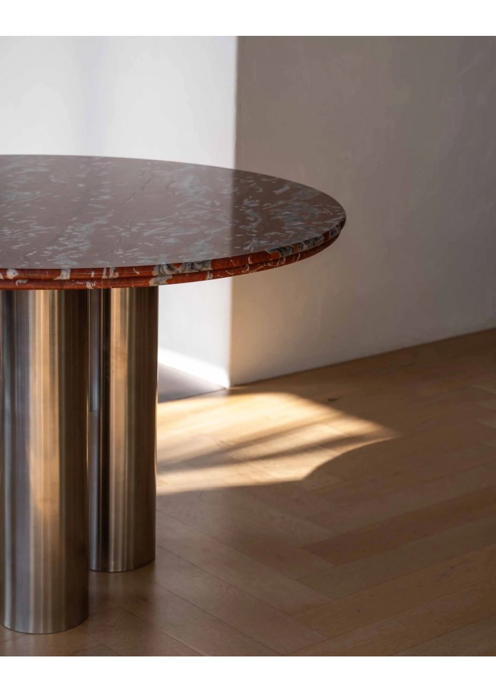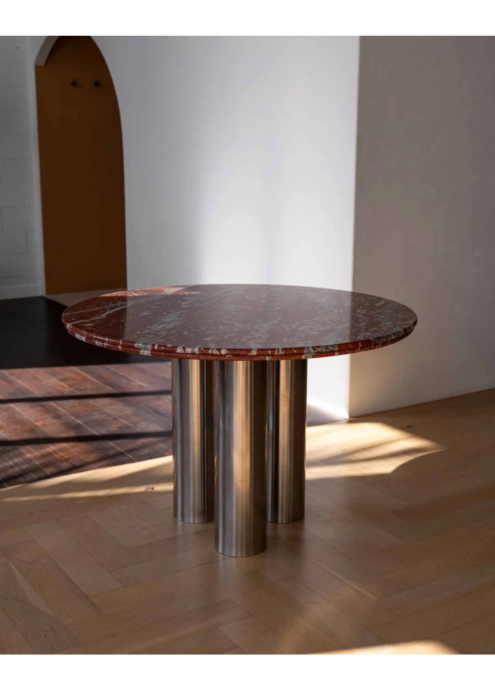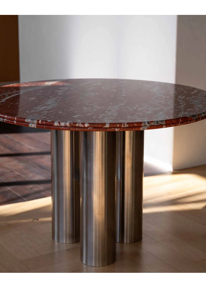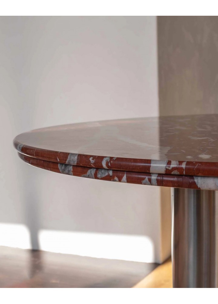 ( Rosso levanto ) Elazığ Vişne mermerin derin ve dinamik damar yapısı, ürüne çarpıcı bir görünüm kazandırırken; üç adet silindirik paslanmaz çelik ayak, tasarımın merkezinde dengeli ve güçlü bir duruş oluşturur.
