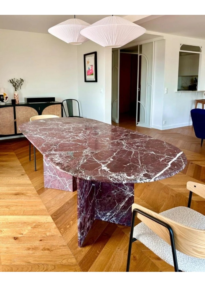 Rosso Levanto V Ayaklı Mermer Yemek Masası, doğal taşın güçlü karakterini sade ve dengeli bir tasarım diliyle buluşturur.