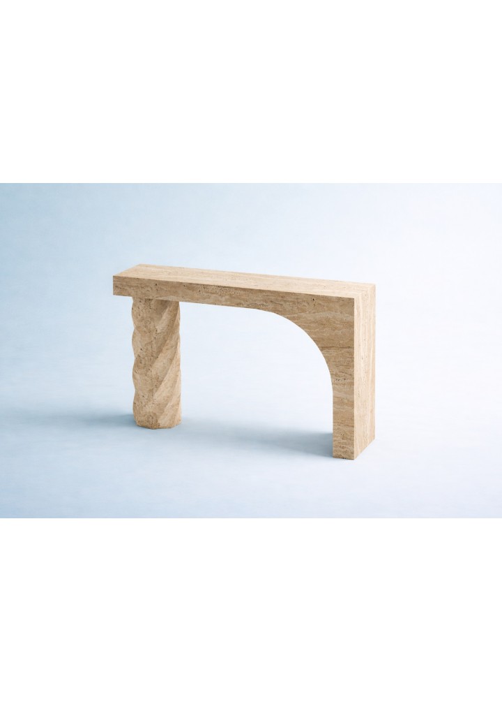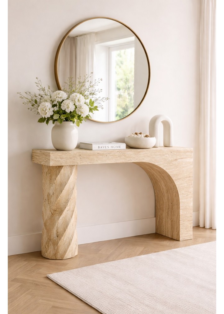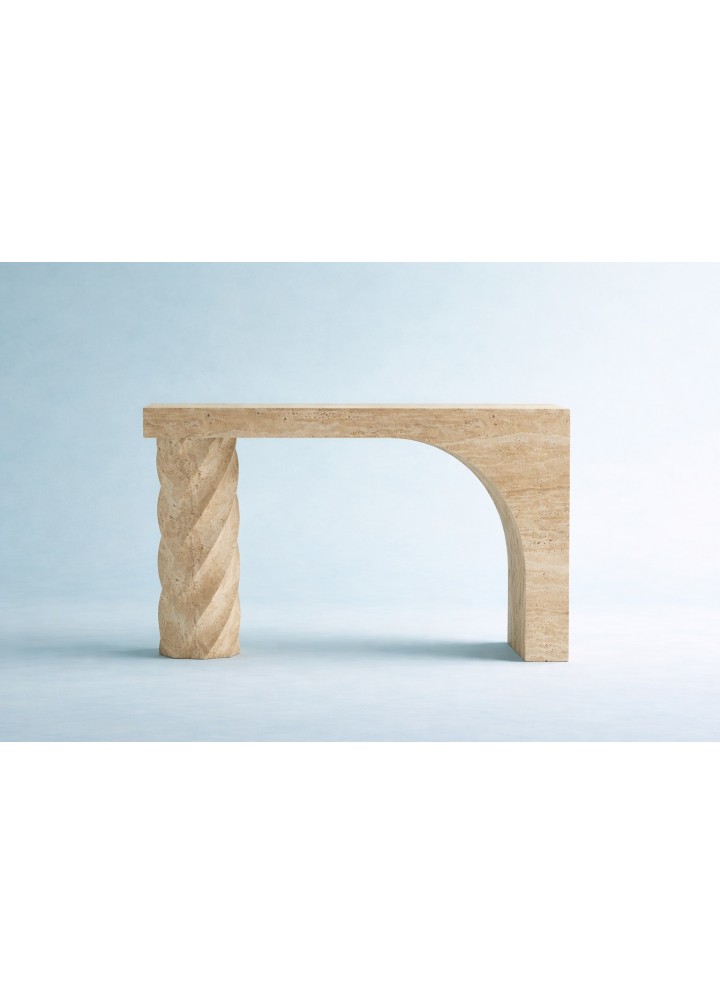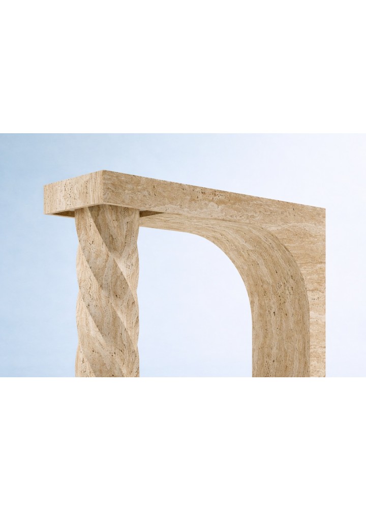 Arc Twist Traverten Dresuar, mimari form ile doğal taşın güçlü karakterini bir araya getiren özel bir tasarımdır. Bir yanda yumuşak geçişli kemer formu, diğer yanda dinamik burgu ayak detayı ile dengeli ama dikkat çekici bir silüet oluşturur.