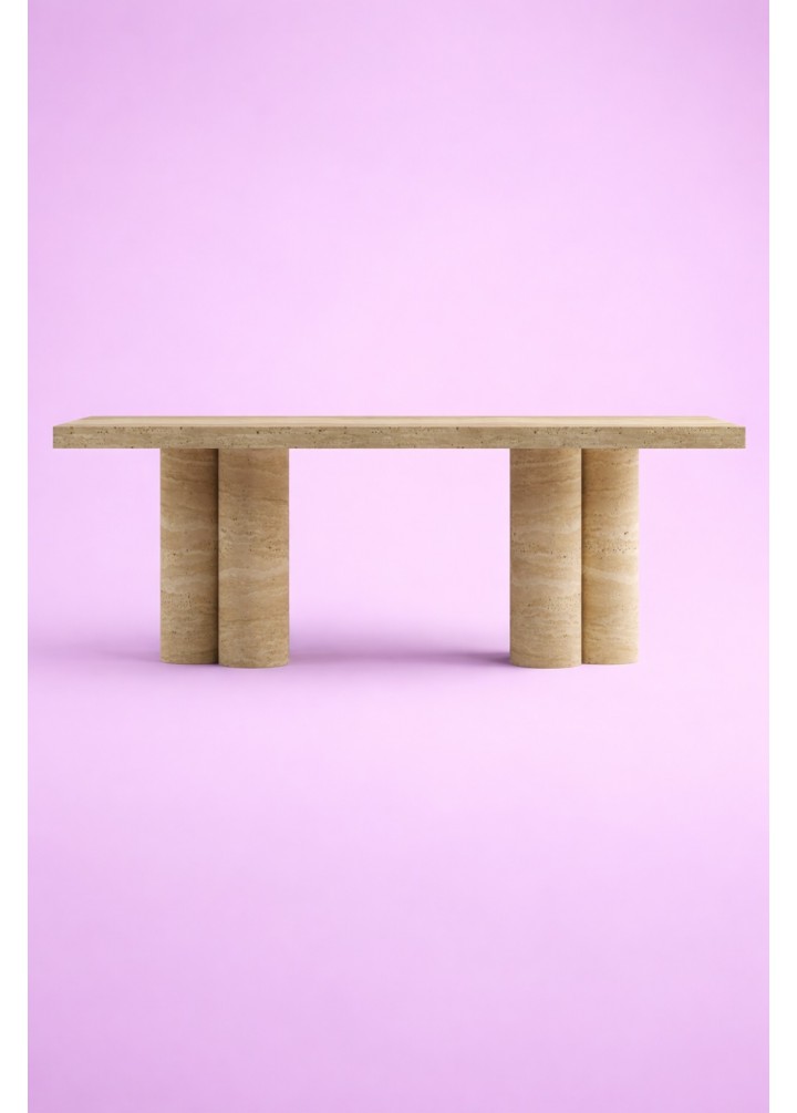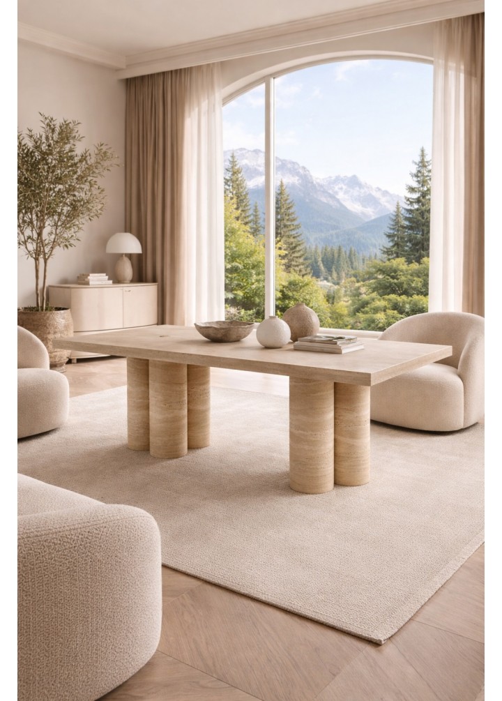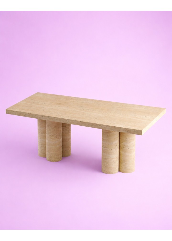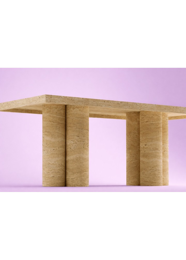 Hexa Traverten Yemek Masası, üçlü gruplar halinde konumlandırılmış toplam 6 silindir ayak üzerine kurulu güçlü bir mimariye sahiptir. Her üçlü grup, kendi içinde dengeli bir taşıyıcı sistem oluştururken; karşılıklı yerleşimleri sayesinde masaya kusursuz bir stabilite kazandırır.