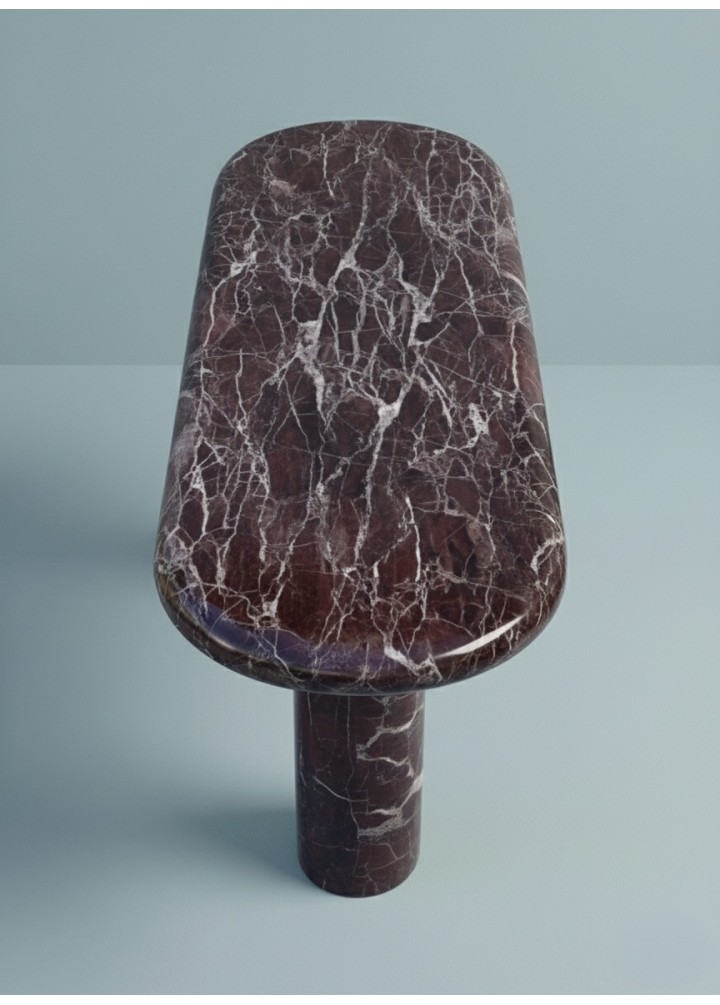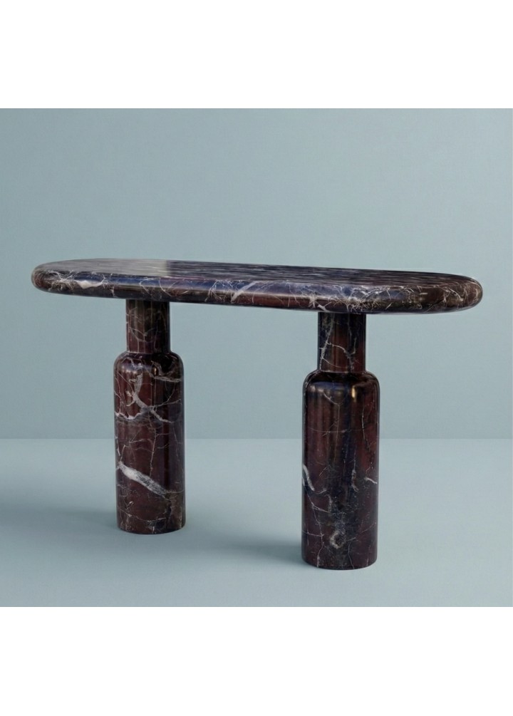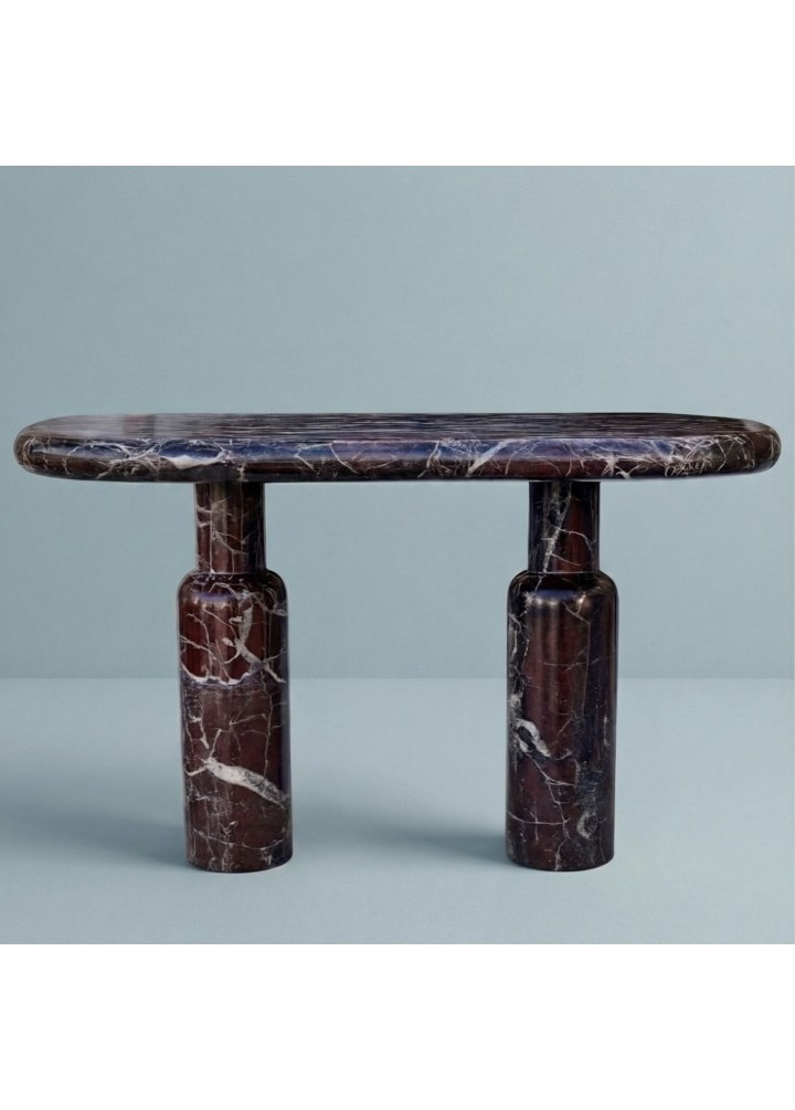 Form olarak yalın ama etkili bir çizgiye sahiptir. Üst tabla yuvarlatılmış kenarlarıyla yumuşak bir siluet oluştururken, masif mermerden tek blok olarak işlenen silindirik ayaklar dresuara heykelsi bir ağırlık ve denge kazandırır.