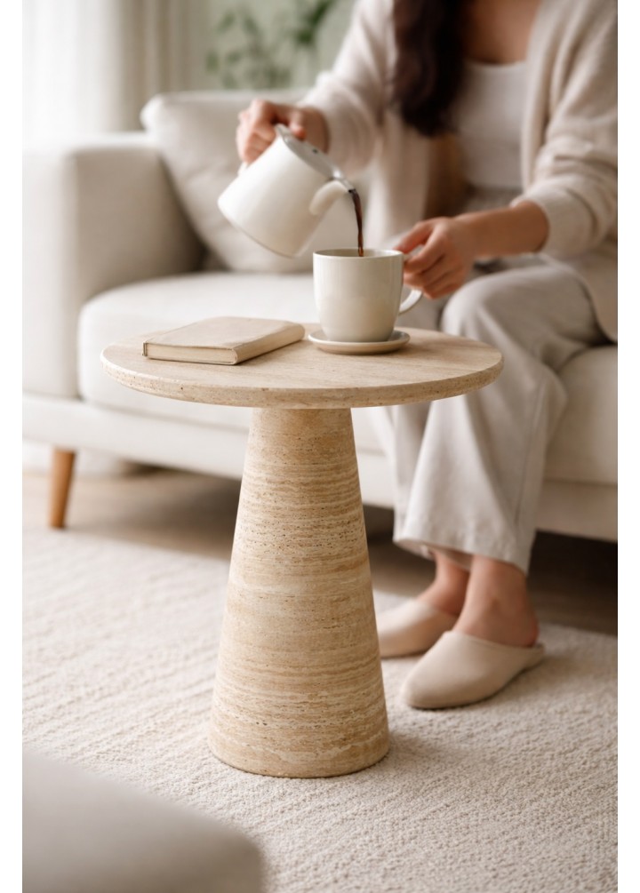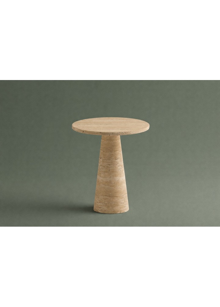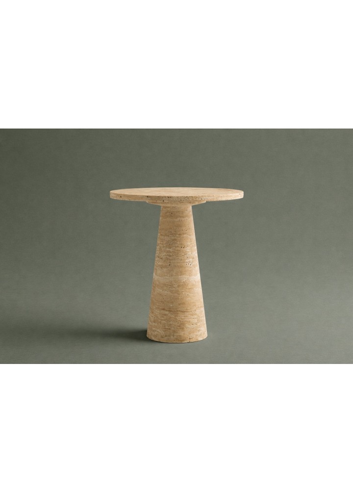 Doğal travertenin zamansız dokusu ile tasarlanan Konik Yan Sehpa, minimal formu ve güçlü duruşuyla yaşam alanlarına sade bir karakter kazandırır. Tek parça konik ayak yapısı sayesinde hem dengeli hem de estetik bir silüet sunar.