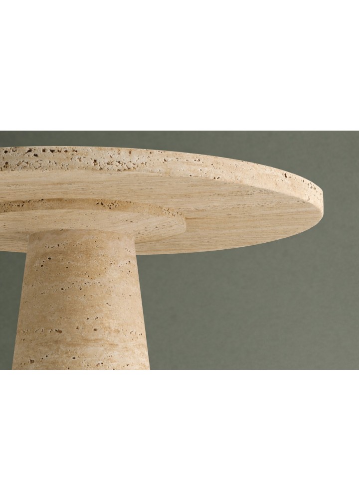Yumuşak hatlara sahip yuvarlak tablası, günlük kullanımda pratiklik sağlarken travertenin kendine özgü gözenekli yapısı her ürünü benzersiz kılar. Modern, doğal ve rafine bir atmosfer oluşturmak isteyenler için ideal bir tamamlayıcıdır.