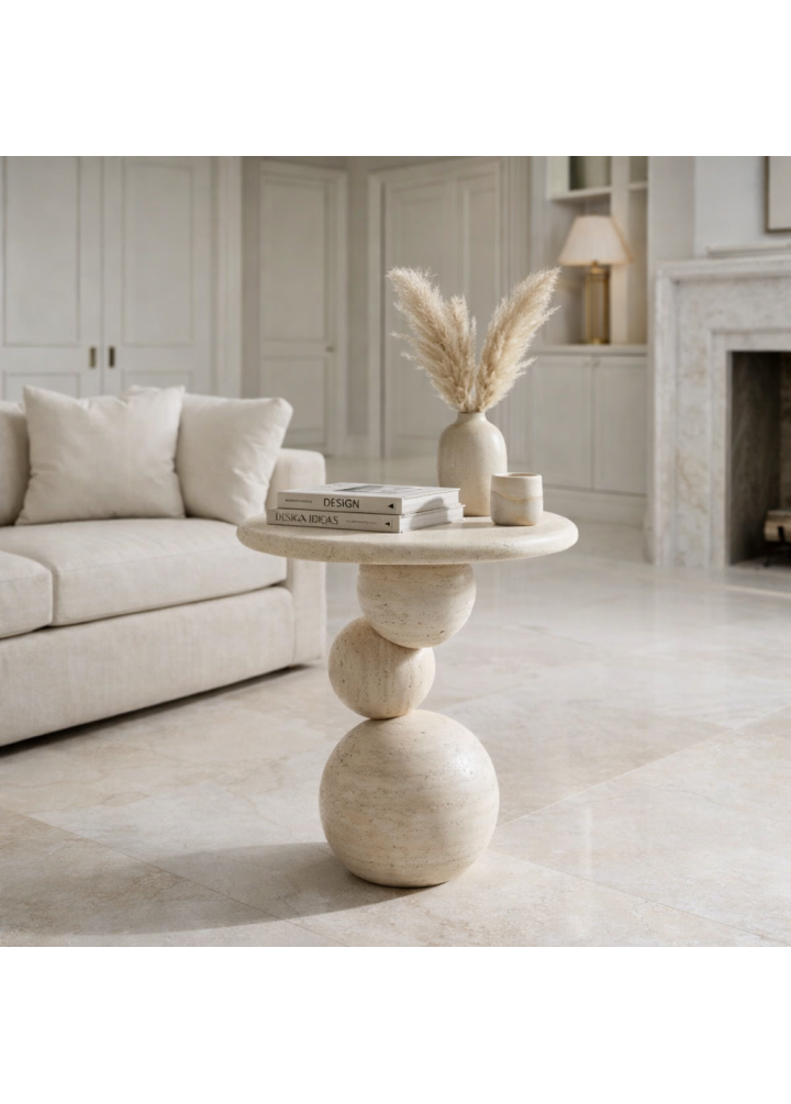 Bu sehpa bir mobilya değil; mekânda duran küçük bir heykel. Travertenin doğal gözenekli dokusu, küresel formun yumuşaklığıyla birleşerek sert taşın içindeki sakinliği ortaya çıkarıyor.